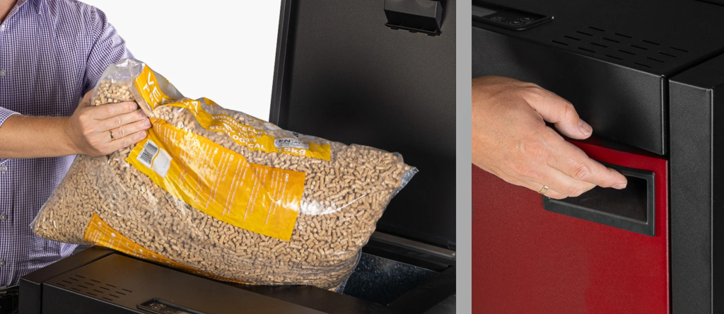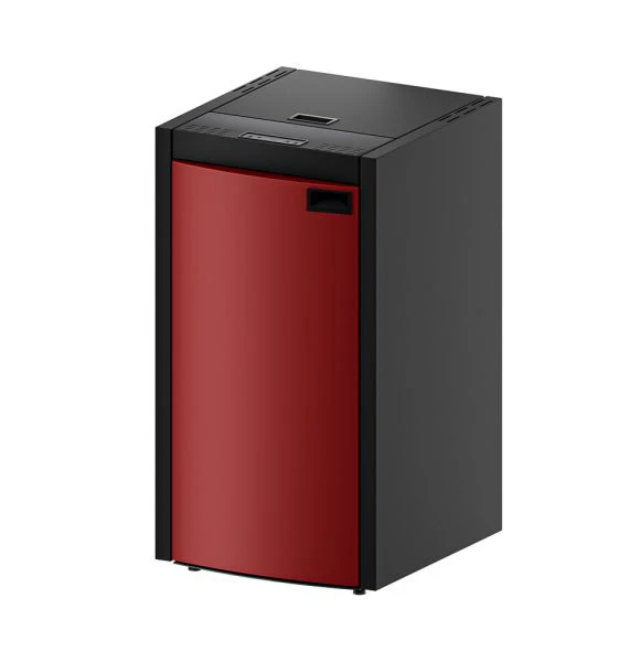 Ten kocioł na pellet łączy nowoczesną technologię z eleganckim wyglądem. Niska konstrukcja sprawia, że uzupełnianie pelletu jest wyjątkowo wygodne. Dopracowany design w głębokiej czerni i bordowych akcentach nadaje urządzeniu wyjątkowego charakteru – kocioł nie tylko ogrzewa dom, ale też prezentuje się estetycznie w każdej kotłowni.
