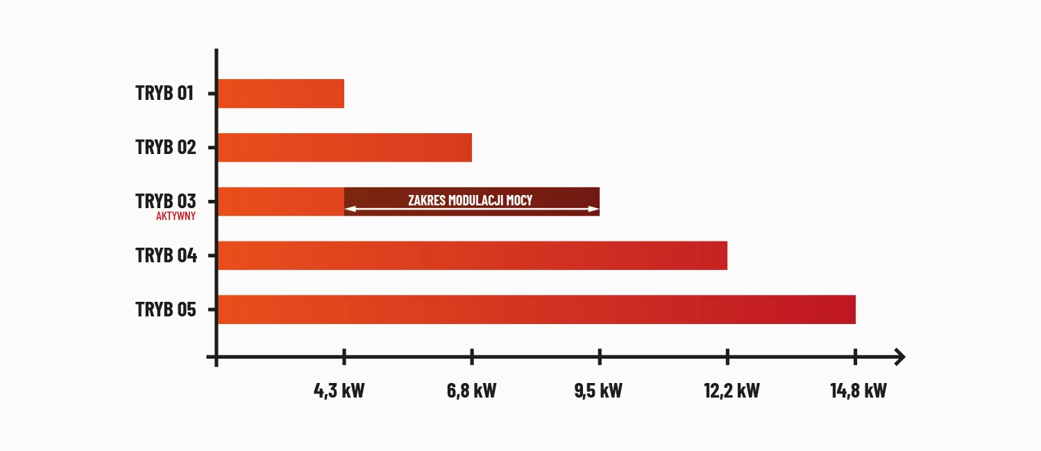 Masz, aż 5 zakresów pracy do wyboru. Np. ustaw moc na 3, a kocioł będzie pracował w zakresie 4,3 – 9,5 kW.