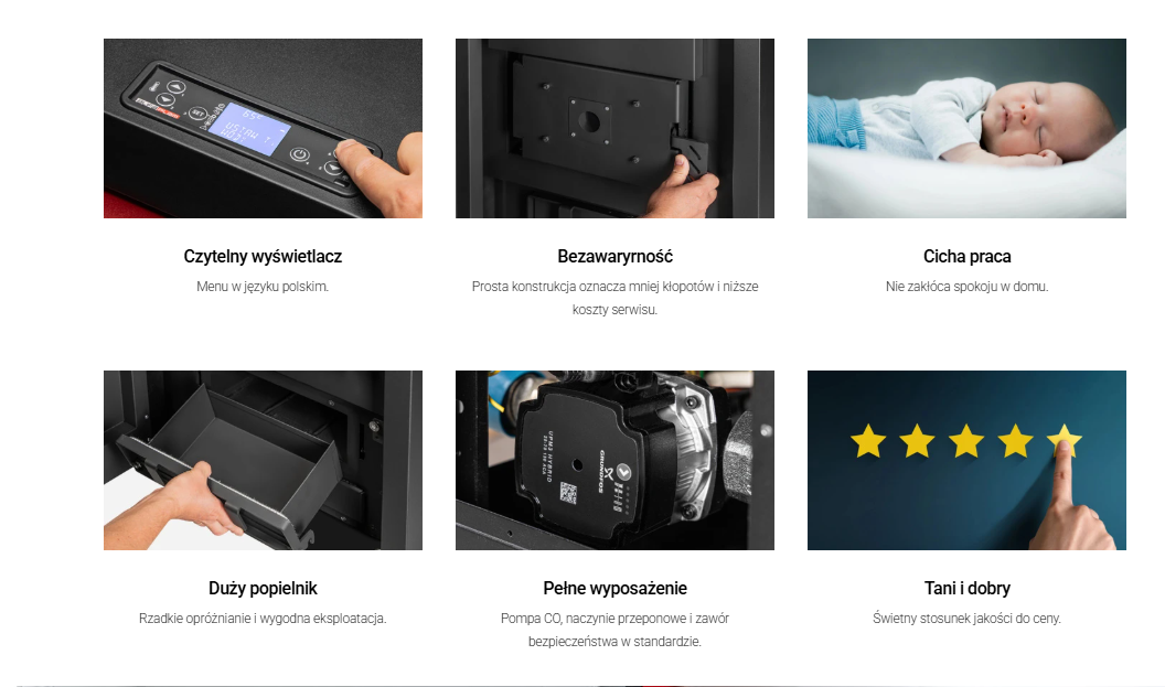 Poniżej znajdziesz zestawienie kluczowych zalet kotła, które obrazują jego konstrukcję, wygodę obsługi oraz rozwiązania techniczne. Dzięki nim zrozumiesz jak funkcjonalne, wygodne i dopracowane w każdym detalu jest to urządzenie. To praktyczne podsumowanie, które pomoże Ci dokładniej poznać produkt i ocenić jego dopasowanie do Twoich potrzeb.