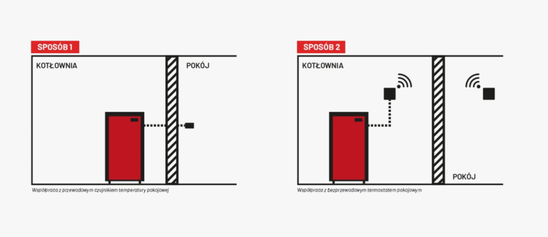 Commo Compact 15 może być obsługiwany przez wbudowany czujnik temperatury lub termostat pokojowy. To znaczy, że kocioł może na dwa sposoby utrzymywać temperaturę w pomieszczeniu. W przypadku sposobu 1 żądaną temperaturę pokojową ustawia się na panelu w kotle. W przypadku sposobu 2 żądaną temperaturę pokojową ustawia się na termostacie. Termostat pokojowy nie jest na wyposażeniu kotła. Należy go dokupić osobno.